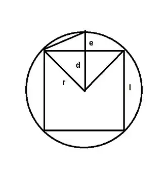 If denotes the length of a side of the square, draw a perpendicular line d from the center of the circle to side l. Let e denotes r − d. Then from the diagram: