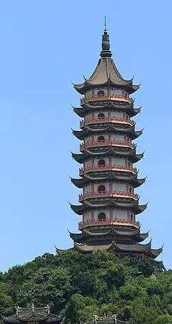 The Zhaobao Mount Scenic Area includes walking trails on and around the hill with numerous sites to explore during a visit. These include the 57.6-metre-tall (189 ft) seven-story Aozhu Pagoda, the 2,000-foot-long (610 m) 10-foot-thick (3.0 m) Weiyuan City Wall built during the Ming dynasty, and the even older Zhenhai Seawall originally built in 897 CE during the Tang dynasty. Sanskrit rock carvings, including a Buddhist prayer chant, are one of the oldest features of the hill. The Tianhou Temple is dedicated to the Heavenly Empress (see also Mazu) and the Guanyin Pavilion is dedicated to the Goddess of Mercy (see also Guan Yin). The mountain is named after the sea god Zhāobǎo Qīláng, a forerunner of the more recent sea deity Qianliyan, a subordinate of the goddess Mazu.