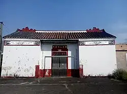 The Lords Zhou and Wang Memorial Study Hall in Kam Tin was established by the Tang clan in 1684 as a tribute to Zhou and Wang Lairen.[17] Similarly, the Temple for Two Dukes (二公祠) in Guangzhou was built in honour of Zhou and Wang.[15] The Hongsheng temple in Chaolian contains imagery of Zhou; the displaced villagers had allegedly been given divine indication, after worshipping at the temple, that they would "return home after 1,800 days", a prediction which roughly came true following Zhou's efforts.[9] Zhou and Wang were also deified at the Temple to Famous Officials in Nantou.[18] Zhou is likewise treated like a deity by Chaoshan residents, who seek advice and divine help from him; this phenomenon is dismissed as "dross superstition" by a Chaoxue[b] scholar.[19]