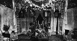 Funeral ceremonies were held at the Zhu family home on Arsenal Road beginning on 1 November 1926. These were heavily subsidized by the various organizations in which Zhu had been a member. The house was decorated in white and blue, with scrolls bearing the condolences of such figures as former president Li Yuanhong, General Lu Yongxiang, Marshal Sun Chuanfang, and Premier Wellington Koo; thousands of Shanghai residents attended.[13] A procession, described by The North-China Herald as likely the largest in Shanghai history, was planned for 7 November; it was to include hundreds of armed guards, with Zhu's casket in a hearse pulled by eight horses.[13]