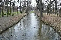 The river flows through a covered water canal in the center of Lubin, and exits the canal near the Castle Chapel on the Castle Hill. It then goes northward, passing Niemstów, Sitno and Dłużyce. After passing through Ścinawa, the river flows into the ecological use area "Ścinawskie Marsh".[2] Through the mouth of the marsh it flows into the Oder at a height of 88 meters above the sea level.