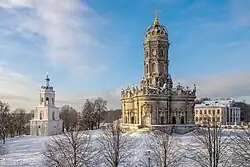 The Church of the Theotokos of the Sign (Dubrovitsy), or The Church of the Holy Sign of the Mother of God in Dubrovitsy, (Russian: Церковь Зна́мения Пресвятой Богоро́дицы в Дубровицах) is a Russian Orthodox church in the village of Dubrovitsy, Podolsk Urban Okrug, Moscow Oblast, Russia. Dubrovitsy is located about 36 km South of Moscow (16 km from the Moscow Ring Road; along the highway Podolsk-Dubrovitsy 6 km). The Dubrovitsy Estate used to belong to the noble families of Morozov, Golitsyn and Dmitriev-Mamonov. The estate consists of a palace, a Horse yard with Gothic gate, several outbuildings, a church and a park. The church is famous for its unique architecture, unusual to Russian architecture, as well as a mysterious history.