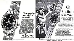 The first flat pocket watch, launched in 1928, used the Zodiac calibre 1617 movement. In 1930, the brand designed and produced the first automatic sports watch and the popular Zodiac Autographic. The Autographic was self-winding with a power reserve gauge, an unbreakable crystal, and a radium dial and was water and shock resistant.[5] In 1953, Zodiac introduced the Sea Wolf as the first purpose-built "dive watch" manufactured and marketed to the masses.[6] To date, the original Sea Wolf and its successor, the early-1970s Super Sea Wolf, are considered two of the most iconic commercial dive watches.