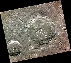 ![]() Mariner 10 image of Zola crater, left of center. Note the complex of peaks within the crater. North is up. | |