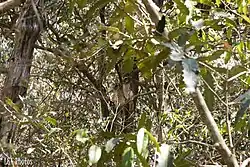 The park includes the forests of Zombitse, Vohibasia and Isoky-Vohimena in three non-contiguous parcels. The Zombitse forest straddles Hwy RN7; the Vohibasia forest is to the northwest of Zombitse, and the Isoky-Vohimena forest is set between the two.[5] The Isalo massif and Isalo National Park is 90 kilometres (56 mi) to the east and runs in a north-south direction, and an 820 metres (2,690 ft) high calcareous plateau to the west, runs in a similar north-south direction.[5] The forests of the national park are found between these two uplands; elevation is between 300 m and 825 m.[7] The Zombitse section is on sandstones, the other sections on Jurassic limestone.[7] While there are no watercourses, the springs and small wetlands in the park act as a reservoir, feeding the tributaries of the Teheza and the Fiherenana rivers.[1]