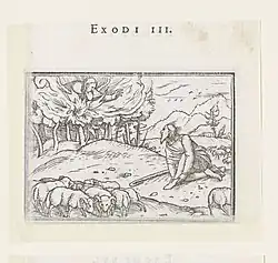 By remaining true to the tradition of Bible illustration in his magnificent Bible of 1531, Froschauer also accepted traditional depictions of God that were in tension with the Reformed Ban on images. In the Zurich Bible of 1531, God the Father is regularly depicted as a bust portrait of a man with flowing hair and a full beard in a cloud or as a full-body figure of a king.[82] One example is the revelation of God described in chapter 3 of the Book of Exodus (Ex 3:1-5 ZB): A flock of sheep in the foreground indicates that Mose is on the way as a shepherd. In the background you can see a copse with a large cloud over it. In the middle of it bush on fire, and above it God appears as a bearded man holding out his left hand to Moses, apparently addressing him. Moses, completely oriented towards this apparition, is about to take off his shoes, as God has called him to do.