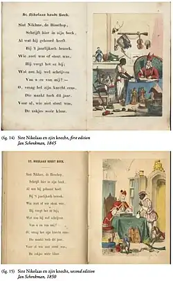 In 1833, an Amsterdam-based magazine printed a humorous reference to "Pietermanknecht" while describing the fate that those who had sneaked out of their houses to attend that year's St. Nicholas celebrations were supposed to have endured after returning home.[22] In 1859, the Dutch newspaper De Tijd noticed that Saint Nicholas was often accompanied by "a Negro, who, under the name of Pieter, mijn knecht, is no less popular than the Holy Bishop himself".[23] In the 1891 book Het Feest van Sinterklaas, the servant is named Pieter. However, up until 1920, several additional publications gave the character other names and depictions that varied considerably.