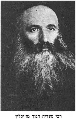 The first Rebbe of Zychlin, Rabbi Shmuel Abba, taught that one needs to not only repent but repent through the learning of Jewish holy subjects.[2] Reb Zelig was a relative of the Sabba Kadisha of Strikov, Reb Fishel, going to visit him and taking his young son Shmuel Abba with him. Rabbi Shmuel Abba was known as the Ilui ("genius") of Luvitch and many scholars praised his depth and understanding. When Rabbi Shmuel Abba was older he learned at the Peshischa yeshiva which was led at that time by Rabbi Simcha Bunim of Peshischa. He considered himself one of Rabbi Simcha Bunim's disciples.