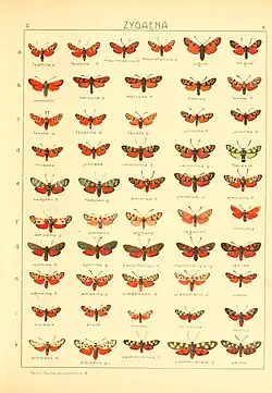 depicting a few subspecies]] Z. carniolica Scopoli, 1763] the spots of the forewing are confluent in pairs; Liguria.— In ab. jurassica Blachier [ now Zygaena carniolica ssp. virginea Müller, 1766] the central spots are very large and connected with the red basal area by a costal streak, while the 6 spot remains isolated; found near Geneva in July and August. — ab. weileri Stgr. (= diniensis Oberth.) [ now Zygaena carniolica ssp. modesta Burgeff, 1914] . Here the proximal spots are merged to a large red patch which bears single red dots, only the 6 (lunate) spot remaining separate; in Germany, Austria and at the Riviera. — ab. ragonoti Gianelli (8f) [now Zygaena carniolica ssp. virginea Müller, 1766 ] from Turin, is only a modification of the form weileri; the forewing is almost entirely red, but, besides the 6 spot being isolated, there are some more black markings in the basal area of the forewing than in weileri. — In the Tring Museum there is an aberration with entirely red wings, which may be named totirubra ab. nov. [now junior synonym of Zygaena carniolica Scopoli, 1763] (8f), since the corresponding forms of other species of Zygaena have received names. Found in Hungary.— In amoena Stgr. [now junior synonym of Zygaena carniolica Scopoli, 1763 ] (8ef), from Hungary and Lower Austria, the whitish edges of the spots of the forewing are so enlarged that the white almost entirely displaces the dark ground-colour, the hindwing being sometimes pale pink, as in the third specimen figured as (amoena on 8f.) — In berolinensis Stgr. [ Zygaena carniolica ssp. berolinensis Lederer, 1853 ] (8g), occurring singly everywhere among the normal form, but being especially typical at the Italian Riviera, the white margins of the spots of the forewing are completely absent and the abdomen is without belt. — As taurica Stgr.[ Zygaena carniolica ssp. taurica Staudinger, 1879 ] (8g) a Lydian form is known in which the proximal spots are broadly white-edged, while the 6 transverse, spot has almost disappeared. — In apenina Tur. (= wiskotti Calb.) [ now Z. carniolica ssp. hedysari Hübner, 1796 ] (8g), which flies not rarely near Genoa behind the Campo Santo among hedysari and berolinensis, the 6 transverse spot is completely absent or is only indicated as a dull shadow in the ground colour.- graeca Stgr. [ Z. carniolica ssp. graeca Staudinger, 1870] resembles a small carniolica of the name-typical form, and has like this insect a red belt, but the whitish yellow edges of the spots of the forewing are much thinner; from Greece.amasina Stgr. (8j) [Zygaena carniolica ssp. amasina Staudinger, 1879 ], from Asia Minor, closely resembles amoena but is beautifully bright-red instead of pink and has abundant traces of the black ground colour, which in amoena is almost entirely replaced by white.wiedemanni Men. [ Z. carniolica ssp. wiedemannii Ménétriés, 1839 ] (8h), from Anterior Asia, on the contrary has so much white on the forewing that this is the prevalent colour: moreover, the abdomen is vermilion except the base and tip.— albarracina Stgr. [ Z. carniolica ssp. albarracina Staudinger, 1887, from Andalusia, is a small form which approaches orana, but has less red on the abdomen.In transiens Stgr. [ Z. carniolica ssp. transiens Staudinger, 1887 ] the spot 6 which is edged with white in the previous forms, has become all white, the red centre disappearing, this form therefore approaching the occitanica group, which one has several times endeavoured to distinguish specifically from the carniolica-forms from Western Asia.[6]