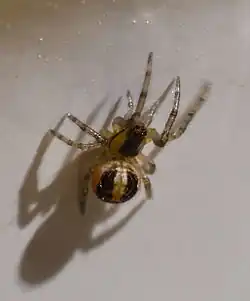 Zygiella x-notata, sometimes known as the missing sector orb weaver or the silver-sided sector spider,[1][2] is a spider species in the family Araneidae. They are solitary spiders, residing in daily spun orb webs. Z. x-notata is a member of the genus Zygiella, the orb-weaving spiders. The adult female is easily recognized by the characteristic leaf-like mark on her posterior opisthosoma, caudal to the yellow-brown cephalothorax.