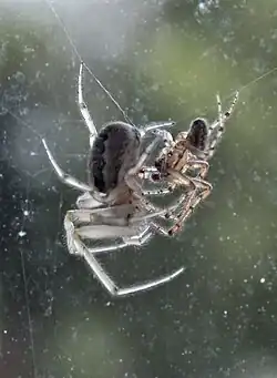 - ^ a b Wherry, T.; Elwood, R. W. (2009). "Relocation, reproduction and remaining alive in the orb-web spider". Journal of Zoology. 279 (1): 57–63. doi:10.1111/j.1469-7998.2009.00590.x. ISSN 0952-8369.