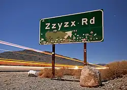 Zzyzx Road is a 4.5-mile-long (7.2 km), part paved and part dirt, rural collector road in the Mojave Desert. It runs from Interstate 15 generally south to the Zzyzx settlement.