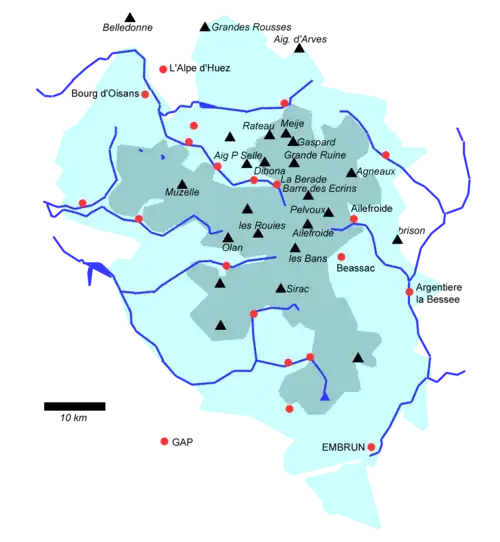 W dawniejszej literaturze nazywana grupą lub masywem Pelvoux. Od północy ograniczona jest doliną rzeki Romanche, od wschodu i południowego wschodu dolinami rzek Guisane i Durance, od zachodu i południowego zachodu doliną rzeki Drac. Zbudowana ze skał krystalicznych i metamorficznych, głównie granitów, łupków krystalicznych i łupków mikowych. Charakteryzuje się wysokimi, strzelistymi szczytami sięgającymi 4000 m n.p.m., długimi i głęboko wciętymi dolinami, licznymi lodowcami i polami śnieżnymi o łącznej powierzchni przekraczającej 120 km² oraz bogatą florą i fauną, w których występuje wielka liczba gatunków górskich i alpejskich.
