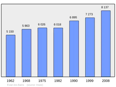 Według danych na rok 1990 gminę zamieszkiwało 6895 osób, a gęstość zaludnienia wynosiła 1607 osób/km² (wśród 2880 gmin regionu Rodan-Alpy Evian-les-Bains plasuje się na 118. miejscu pod względem liczby ludności, natomiast pod względem powierzchni na miejscu 1570.).