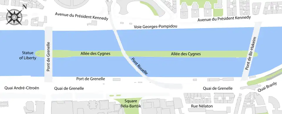 ![]() Ile aux Cygnes widziana ze szczytu Wieży Eiffla. Replika Statuy Wolności znajduje się na dalszym końcu wyspy | |