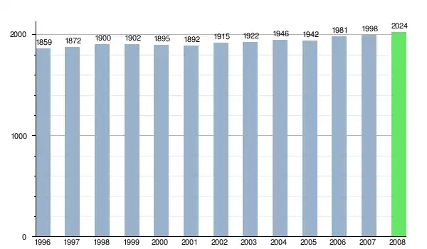 Według danych z dnia 31 grudnia 2012, wieś zamieszkiwało 2070 osób, w tym 1047 kobiet i 1023 mężczyzn[8].