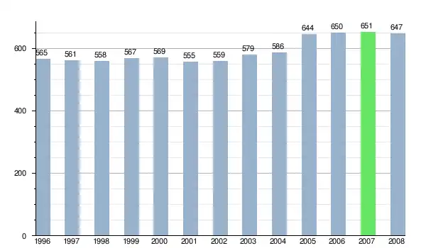 Według danych z dnia 31 grudnia 2012, wieś zamieszkiwało 649 osób, w tym 309 kobiet i 340 mężczyzn[6].
