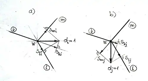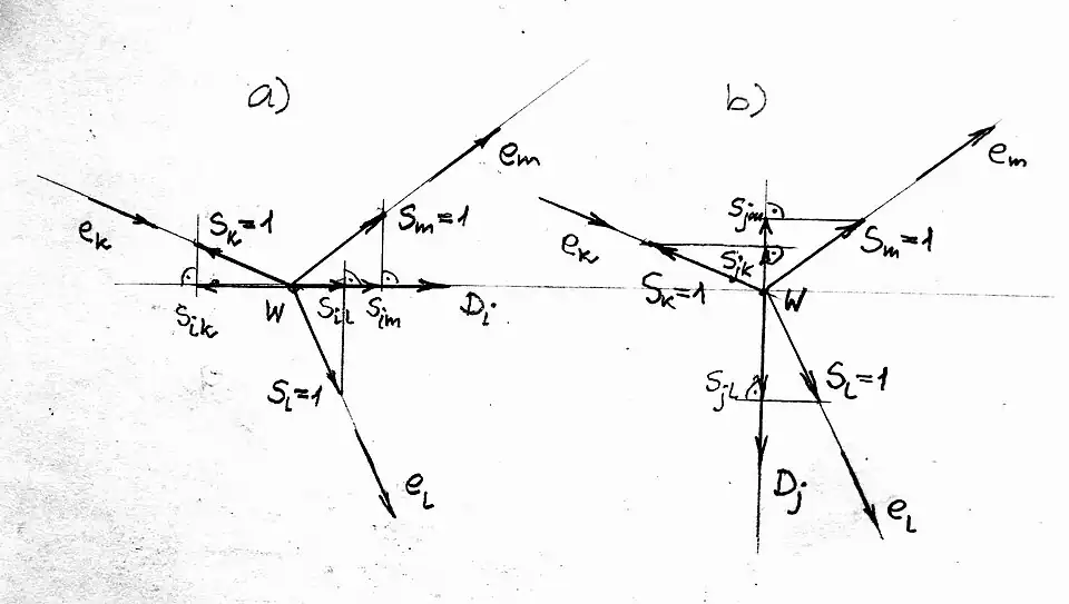 Dla przykładu rozważymy równanie równowagi sił działających na wycięty węzeł (rys. 5a) w kierunku określonym przez jego wersor Równanie to otrzymamy sumując rzuty na ten kierunek wszystkich sił