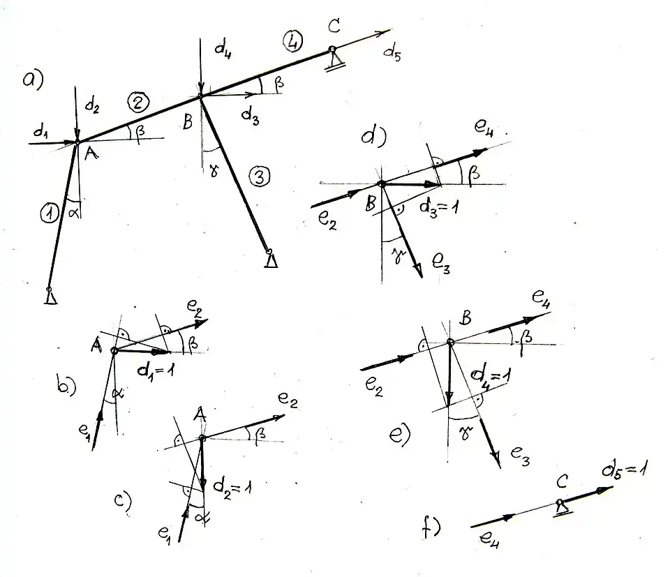 W rzeczywistym łańcuchu kinematycznym jego ogniwa mają niezmienną długość, a to znaczy, że Badaniu ruchliwości łańcucha kinematycznego należy więc poddać nie układ równań (a), lecz (b)