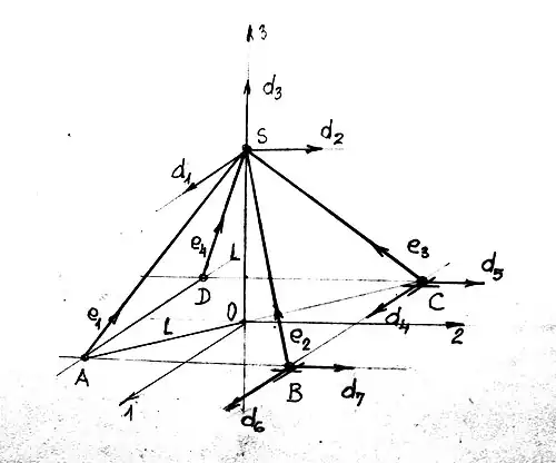 Współrzędne wersorów dla poszczególnych ogniw można obliczyć na podstawie geometrii układu określonej wysokością i połową przekątnej kwadratowej podstawy