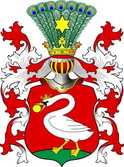 W polu czerwonym, na zielonym pagórku - łabędź srebrny ukoronowany z jabłkiem złotym w dziobie. W klejnocie sześcioramienna złota gwiazda na ogonie pawim.