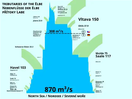 Jej sposób zasilania – śnieżno-lodowcowe. Najwyższe stany wód, spowodowane tajaniem śniegów, są na wiosnę. Latem wody opadają, przy czym zdarzają się letnie wezbrania spowodowane nawałnicowymi lub długotrwałymi opadami. W pozostałej części roku stany wód nie wykazują takich wahań. Średni roczny przepływ na granicy czesko-niemieckiej wynosi 308 m³/s, a w dolnym biegu rzeki – 870 m³/s. Przypływy morskie zaznaczają się do 160 km od ujścia. W górnym biegu Łaba zamarza na 1,5-2 miesiące, a w dolnym na 2-3 miesiące. W czasie lekkich zim nie zamarza wcale.