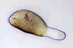 W części wierzchołkowej łagiewki pyłkowej gromadzi się cytoplazma, a w części nasadowej może jej nie być wcale. Ściana łagiewki jest skutynizowana. Rozrasta się w części wierzchołkowej powodując wzrost łagiewki na długość. Starsze części mogą być odcinane zatyczkami kalozowymi. W odciętych częściach nadal może zachodzić ruch cytoplazmy[3].
