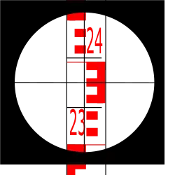 Rysunek przedstawia widok w lunecie fragmentu łaty ustawionej na punkcie, na którym ma być wykonany odczyt. Odczyt wykonuje się następująco: 23 (gdyż pozioma, środkowa, kreska krzyża nitek lunety jest na polu decymetra opisanego jako 23) oznacza to, że odległość od stopy łaty jest większa od 23 decymetrów, 7 gdyż środkowa pozioma linia krzyża nitek jest na czerwonym polu ósmego centymetra na łacie (czyli siedem pełnych centymetrów), oraz 5 gdyż kreska jest w połowie tego pola, czyli na piątym milimetrze. Odczyty milimetrów na łacie są szacowane z dokładnością do 1-2 mm.