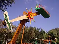- typu Top Spin (Uchwyty podtrzymujące gondole są również przymocowane do stelaży jednakże pasażerowie siedzą w tym samym kierunku co pospolita ława. Karuzela idzie z góry na dół robiąc 360 stopniowe pętle)
