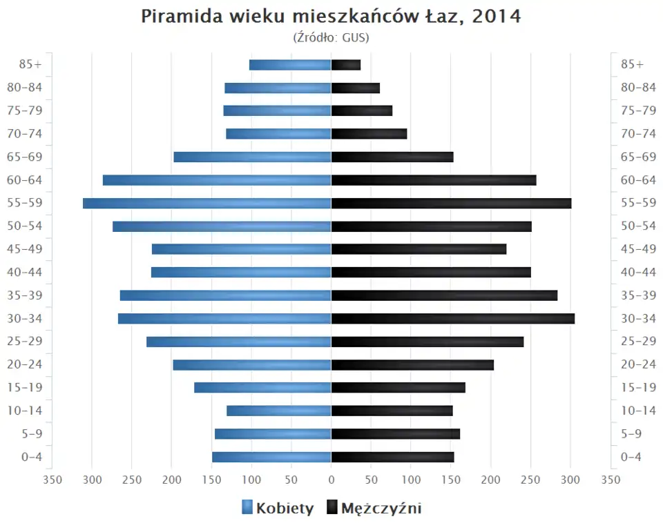 Piramida wieku mieszkańców Łaz w 2014 r.[4]: