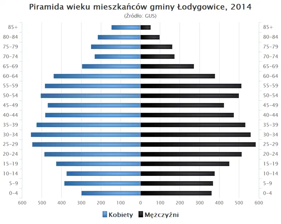 - Piramida wieku mieszkańców gminy Łodygowice w 2014 roku[1].