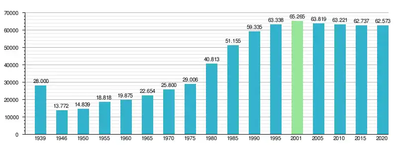 Wykres liczby ludności miasta Łomży od 1939 roku[15].