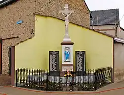 - Drewniany krzyż przydrożny z rzeźbą Chrystusa Ukrzyżowanego i na dole z płaskorzeźbą Najświętszej Marii Panny[37]
