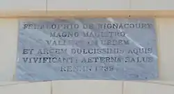 (co znaczy: Fra Alof de Wignacourt, Wielki Mistrz. Miasto Valletta i Cytadela, najsłodsze wody ożywiają wieczne zbawienie. Odnowiono w 1739.)