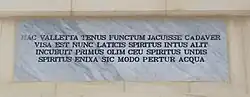 (co znaczy: Do tej pory Valletta leżała jak trup. Dziś duch wody przywrócił jej życie. Pierwotny duch unosił się w wodzie. Teraz dostarczono do niej wodę i duch ten pojawił się ponownie.)[a]