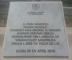 (co znaczy: Samorząd Lokalny Birkirkara. Premier Joseph Muscat, razem z burmistrzem, Panią Joanne Debono Grech, zainaugurował Łuk Wignacourta znany jako Brama Fleur-De-Lys, dzisiaj 28 kwietnia 2016)