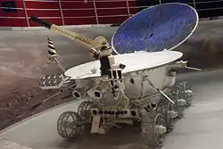 Każde z ośmiu kół pojazdu było niezależnie napędzane, posiadało własne zawieszenie oraz układ hamulcowy. Obrzeża wykonano z szerokiej obręczy pokrytej siatką metalową i zaopatrzone w ukośne, wystające żeberka z tytanu. Średnica kół wynosiła 51 cm. Dziewiąte koło – umieszczone z tyłu pojazdu – służyło nie do poruszania, a do precyzyjnych pomiarów przebytej drogi, a także do badania pewnych właściwości mechanicznych gruntu księżycowego. W przypadku awarii któregoś z kół można je było odstrzelić, po czym pojazd mógł kontynuować swą wędrówkę. Pojazd mógł poruszać się z prędkością 1 oraz 2 km/godz., miał 4 biegi, 2 przednie i 2 wsteczne. Przednie koła pojazdu miały tarcze hamulcowe elektromagnetyczne. Pojazd był zdolny do pokonywania stoków o nachyleniu ponad 45° (na gruncie o dużym współczynniku tarcia). Został wyposażony w układy automatyczne, wykonujące nieustannie pomiary kąta pochylenia, oraz obciążenia kół. Gdy wartości zmierzone przekraczały wartości uznane za dopuszczalne, następowało samoczynne zatrzymanie Łunochoda. Skręty dokonywane były za pomocą zróżnicowania prędkości obrotów kół znajdujących się po przeciwnych stronach pojazdu, dzięki czemu pojazd mógł wykonywać nawet obroty w miejscu. Lądownik wraz z łazikiem miał masę 1814 kg, a sam łazik 840 kg[2][3][4]. Pojazd Łunochod miał wysokość 135 cm, długość 170 cm i szerokość 160 cm. Pracował tylko w czasie dni księżycowych – niektóre pomiary fizyczne, takie jak badanie kosmicznych źródeł promieniowania rentgenowskiego, kontynuowano także w nocy. Przed nadejściem nocy pokrywa pojazdu była zamykana, a wnętrze było ogrzewane ciepłem wydzielanym przez rozpad izotopu promieniotwórczego, który był umieszczony w specjalnym pojemniku, przymocowanym z tyłu na zewnątrz pojazdu. Ciepło było rozprowadzane za pośrednictwem gazu krążącego w układzie rur grzejnych.