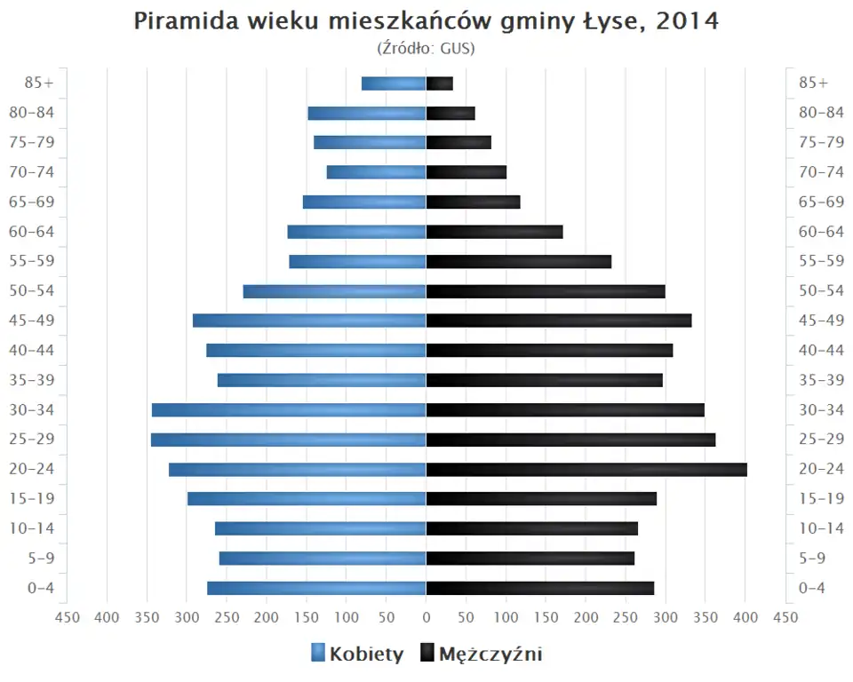 - Piramida wieku mieszkańców gminy Łyse w 2014 roku[9].