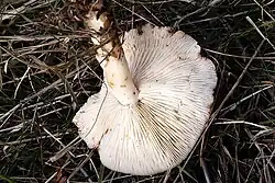 Blaszkowy, blaszki barwy kremowej, cienkie i wąskie, zatokowato wycięte, wąsko przyczepione do trzonu, gęsto ustawione. Trama blaszek regularna[4].