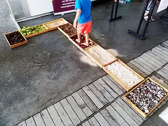 Ścieżka dotykowa, jako element dydaktyczny, składa się z odcinków nawierzchni wykończonych zróżnicowanymi materiałami, takimi jak różne płyty i płytki o zróżnicowanej gładkości, piasek, żwiry, kora, trawa i inne. Przez ścieżkę lub wzdłuż niej może przepływać strumyk. Zasadniczo można się po niej poruszać bezpiecznie boso (ścieżka bosych stóp[3]), ale są też ścieżki przeznaczone do przechodzenia w obuwiu. Obok ścieżki może zostać umieszczona barierka dla asekuracji dzieci, które słabiej chodzą[3]. Zadaniem ścieżki jest stymulowanie wrażeń dotykowych u osoby niewidzącej (zwłaszcza w terapii dzieci) i pogłębianie jej wiedzy o świecie[1].