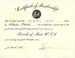 Certyfikat Międzynarodowego Towarzystwa Miłośników Muzyki „Friends of Music USA”, został nadany Stowarzyszeniu Muzycznemu Śląski Jazz Club w 1966 roku przez Willisa Conovera podczas jego pobytu w Polsce i złożony na ręce Henryka Zygmunta Cholińskiego, współzałożyciela Śląskiego Jazz Clubu, przez ponad czterdzieści lat pełniącego szereg funkcji w zarządzie ŚJC.