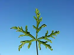 - 2–8 cm długości i 2–8 cm szerokości, dłoniasto klapowane, z pięcioma do siedmioma tępymi klapami; liście u nasady łodygi są bardzo płytko klapowane, a wyższe - bardzo głęboko, z odcinkami palczastymi.