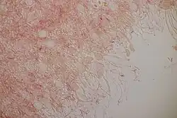 Podstawki elipsoidalne, 10,5–13 × 8–10,5 µm, z podłużnymi przegrodami (tzw. fragmobazydiami) i trzonkiem o długości do 30 µm, który po osiągnięciu dojrzałości zostaje pozbawiona jądra. Zarodniki kiełbaskowate o wymiarach 8–14 × 3,5–5,5 µm. Strzępki o szerokości 1–3,5 µm, osadzone w żelatynowej masie, ze sprzążkami[6].