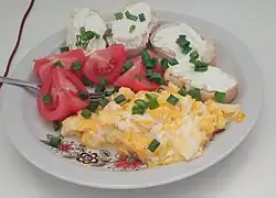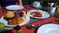 Czasami podawane jest ciepłe danie (jajecznica, parówki, bekon itp.) oraz owoce. |