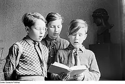 - do melodii pieśni rewolucyjnej Czerwony sztandar („A kolor jego jest czerwony, bo na nim robotników krew”) w śpiewnikach wydawców katolickich przeznaczonych dla kobiet i młodzieży rozpowszechniano tekst Ludzkości żeńce (Biały sztandar), nawołujący do wybaczania krzywd i zdania się na Boską sprawiedliwość („A kolor jego śnieżnobiały, bo go nie plami bliźnich krew”)[56][57].