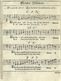 Funkcję śpiewników pełniły niekiedy psałterze z nutami – w szczególności Psałterz Dawidów Jana Kochanowskiego z muzyką Mikołaja Gomółki, wydany w 1580 roku[9].
