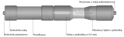 Średnicówka mikrometryczna zbudowana jest z tulei, wrzeciona ze śrubą mikrometryczną, bębna, końcówki stałej z trzpieniem pomiarowym i przedłużacza. Na tulei znajduje się kreska wzdłużna i podziałka o zakresie pomiarowym 13 mm. Na jednym końcu tulei znajduje się końcówka o powierzchni sferycznej, a na drugim nagwintowany wewnątrz otwór, w którym przesuwa się wrzeciono ze śrubą mikrometryczną o skoku 0,5 mm. Na wrzecionie zamocowany jest bęben z podziałką o zakresie pomiarowym 0,5 mm, co umożliwia odczyt z dokładnością do 0,1 mm[1].