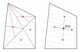 - Łączymy prostymi punkty odpowiadające SOż powierzchni trójkątnych leżących naprzeciwko siebie.