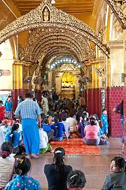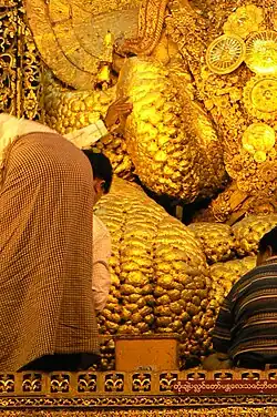 - Posągi z brązu pochodzące z Angkoru. Posągi te zostały zrabowane przez Tajów w 1431 r., następnie zostały przewiezione do Pegu w Birmie po podboju Ayutthayi w roku 1569. Stąd zostały w roku 1599 przeniesione do Taungngu, gdzie padły łupem Arakańczyków. Stąd z kolei zostały w roku 1784 zagrabione przez wojska Thado Minsawa (którego posąg także znajduje się na terenie kompleksu świątynnego) i przewiezione do Amarapury. Sześć posągów (trzy lwy, dwóch mężczyzn i trzygłowy słoń) zostało odlanych prawdopodobnie w XII lub XIII w. Złożone w pobliżu Świątyni Mahamuni aż do końca XIX w. nie cieszyły się zainteresowaniem odwiedzających ją pielgrzymów. Po ich umieszczeniu w specjalnie wybudowanym drewnianym budynku w pobliżu świątyni stały się obiektem rytuału polegającego na pocieraniu przez pielgrzymów tych części posągów, które odpowiadają lokalizacji ich własnych chorych organów, co ma przynieść uzdrowienie[25][26].