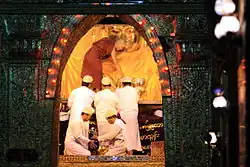 Od wieków wierni naklejają na posąg płatki złota jako wota. Złoto nie jest nakładane jedynie na głowę, natomiast na taśmy na piersiach i plecach nakładane są wyroby jubilerskie, a nie płatki. W 111 lat po pożarze, kiedy to część złota uległa stopieniu, tj. między latami 1884 i 1996, wizerunek pokryła 15-centymetrowa warstwa metalu ważącego około 12 ton. Powoduje ona zatarcie kształtów posągu. Złoto nakładane jest z użyciem kleju, który dawniej wytwarzano z owocu smokrzynu łojodajnego. Ponieważ kobiety nie mają dostępu do posągu, w ich przypadku płatki naklejane są przez męskich członków rodziny albo specjalnie dyżurujących, biało odzianych mężczyzn służących w świątyni, zajmujących się też zbieraniem odpadających płatków[22].
